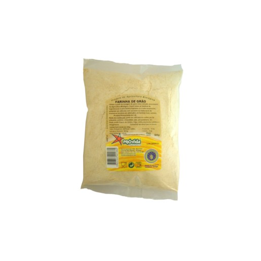 100% grão de bico de produção biológica. Certiplanet, PT-BIO-04, Agricultura não UE. Poderá conter vestígios de glúten. Obtida a partir da moagem de grão. Rica em fibra, proteína, nos minerais ferro, magnésio, fósforo e em vitamina B1 (Tiamina).