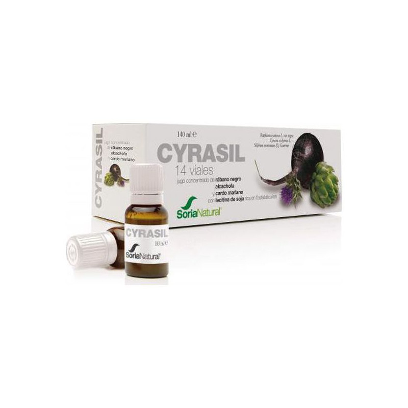 CYRASIL é um produto desintoxicante por excelência já que estimula as principais vias de eliminação de resíduos e toxinas. Contribui para melhorar a capacidade depurativa do organismo, estimulando o bom funcionamento do aparelho digestivo e do rim mas, sobretudo, do fígado e vesícula biliar, favorecendo assim a eliminação fisiológica das toxinas que leva a uma renovação e regeneração interior do organismo ajudando à manutenção de um bom estado de saúde, através de um sumo concentrado de rábano negro, alcachofra e cardo mariano com lecitina de soja rica em fosfatidilcolina.