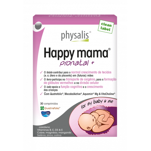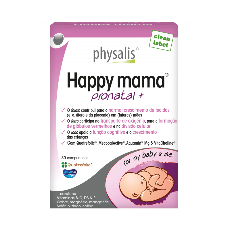 Deseja ser mãe, ou já está grávida e pretende amamentar o seu bebé? Physalis Happy mama® oferece uma formulação completa com vitaminas e minerais para ajudá-la a si e ao seu (futuro) bebé, a viverem esse período de uma forma otimizada. Physalis Happy mama® contém Quatrefolic®, a forma biologicamente ativa do ácido fólico ou 5-MTHF (ligada ao glucosamina). Esta forma é imediatamente utilizável pelo organismo, sem ter de sofrer qual tipo de metabolização, contrariamente a outras formas de ácido fólico. O folato contribui para o normal crescimento de tecidos em (futuras) mães (e. a. do útero e da placenta). Vitamina B12 ativa (MecobalActive®, uma forma muito pura de metilcobalamina), vitamina C e ferro ajudam a reduzir a fadiga. O ferro está envolvido na formação das células vermelhas do sangue e na divisão celular, bem como a vitamina D. O iodo apoia a função cognitiva e o crescimento normal das crianças. Contém ainda colina (VitaCholine®) que contribui para o normal metabolismo da homocisteína. Pode ser utilizado juntamente com Physalis Ómega 3 forte.
