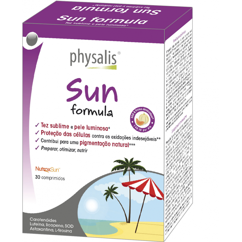 Sun formula é um complexo que contém NutroxSun™, uma mistura de toranja e alecrim clinicamente testada, que melhora a elasticidade da pele e reduz significativamente a vermelhidão após a exposição à radiação UV. Physalis Sun formula contém adicionalmente SOD natural e bioativos extraídos de um tipo muito específico de melão francês (SOD B Primo-Antioxydant®, 140 UI). Este complexo contém: o β-caroteno ou pró-vitamina A, licopeno, luteína e astaxantina (AstaPure®). Da mesma forma, o zinco, a biotina, a vitamina A, as vitaminas B2 e B3 contribuem para a manutenção de uma pele saudável. O selénio e a vitamina E ajudam a proteger as células contra o estresse oxidativo. O cobre contribui para a manutenção da pigmentação normal da pele. Com L-tirosina, o precursor da melanina, um pigmento natural da pele.