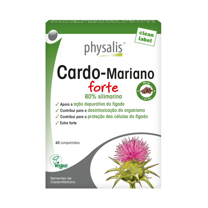 Suplemento alimentar à base de plantas .Physalis Cardo-Mariano forte contém 500 mg de extrato de cardo-Mariano, padronizado em 80% de silimarina. O cardo-mariano, que suporta a função de depuração e desintoxicação do fígado, é particularmente adequado para acompanhar uma cura de purificação. O cardo-Mariano contribui para a proteção das células (fígado) e favorece um bom metabolismo dos açúcares. Para estimular a purificação do organismo: opte por uma dieta equilibrada, reduza ao máximo a ingestão de alimentos gordos e ricos em hidratos de carbono, evite as bebidas alcoólicas e o café. Beba 2 litros de água por dia.
