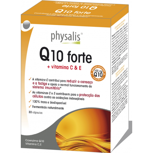 Suplemento alimentar à base de nutrientes. Physalis Q10 forte contém coenzima Q10 naturalmente fermentada, um componente das mitocôndrias presentes em todas as células do corpo humano. As mitocôndrias são as centrais energéticas do organismo. Com a idade, a quantidade de coenzima Q10 naturalmente presente nas células diminui. As vitaminas C e E suportam a proteção das células contra as oxidações indesejáveis, e para além disso a *vitamina C contribui para a redução do cansaço e da fadiga e apoia o normal funcionamento do sistema imunitário.