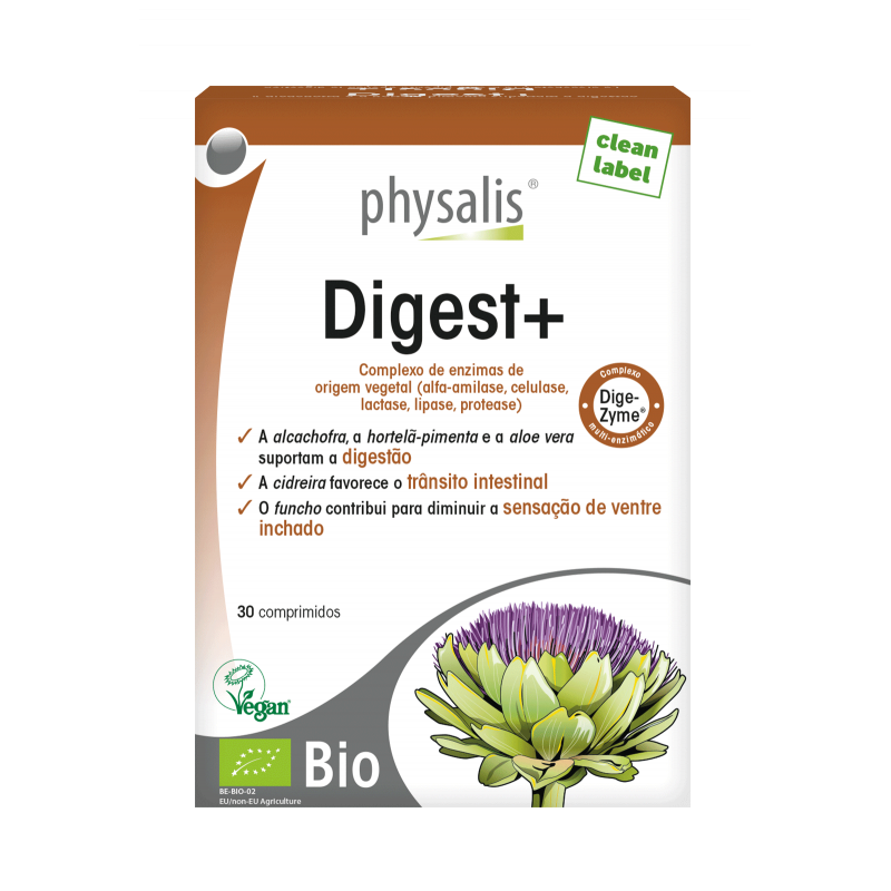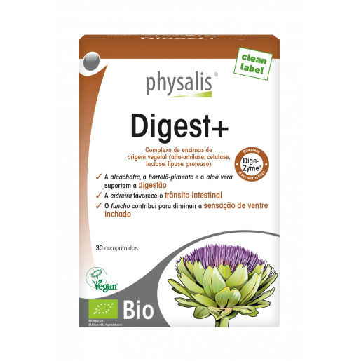 Suplemento alimentar à base de plantas, demasiado rápido, demasiado gorduroso, ou simplesmente demasiado… O nosso modo de vida provoca frequentemente uma sensação de ventre inchado, ou de estômago pesado. Physalis Digest+ bio é um complexo de extratos vegetais de elevada qualidade, entre eles a alcachofra e a hortelã-pimenta que favorecem a digestão e contribuem para aliviar a sensação de enfartamento após a refeição. A cidreira favorece o trânsito intestinal e o funcho contribui para diminuir a sensação de ventre inchado. A baga de esquisandra suporta a função hepática, contribui para a desintoxicação do organismo e para o bem-estar físico em geral. Com a adição de um complexo de enzimas digestivas (alfa-amilase, celulase, lactase, lipase, protease) de origem exclusivamente vegetal! Para uma digestão equilibrada limite a porção das suas refeições, controle a qualidade e variedade da sua dieta, e reservar o tempo adequado para comer, sem pressa. Evite pratos demasiado temperados e gordurosos, bem como as bebidas alcoólicas e o café.