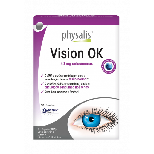 Suplemento alimentar à base de plantas e de nutrientes. Physalis Vision Ok contém zinco e óleo de peixe com um teor de 70% de ácidos gordos omega-3 DHA, que contribuem para a manutenção de uma visão normal. Esta ação é reforçada pela adição de beta-caroteno natural, que é transformado no organismo em vitamina A. As vitaminas C e E ajudam a proteger as células contra as oxidações indesejáveis. Contém ainda uma extrato de mirtilo, com 36% de antocianinas que participam na circulação do sangue nos olhos, e luteína. (* O efeito benéfico é obtido com uma dose diária de 250 mg de DHA.)