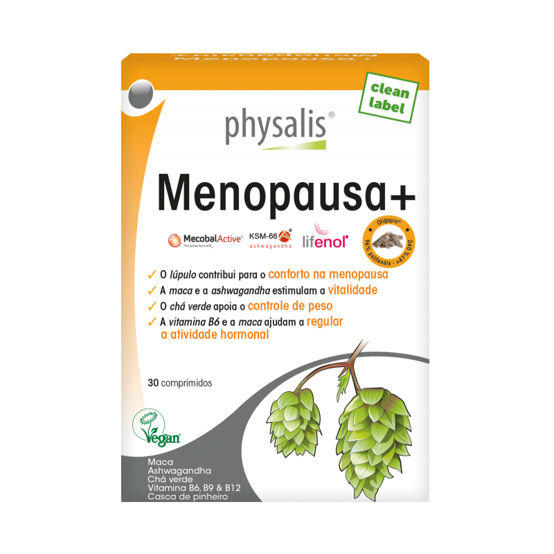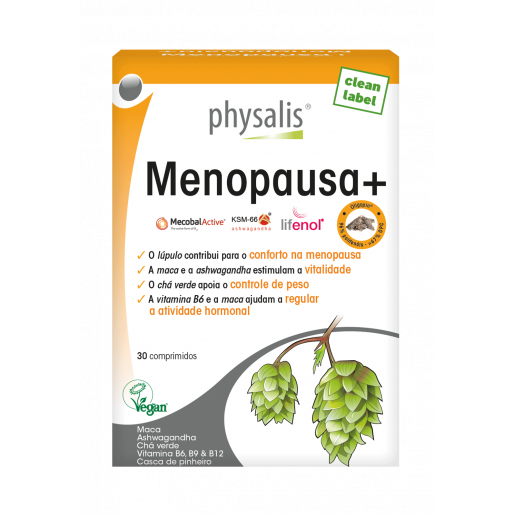 Suplemento alimentar à base de plantas e nutrientes. A transição ou menopausa é um fenómeno natural na vida das mulheres. A idade média da menopausa situa-se entre os 45 e os 55 anos. Certas mulheres sentem ao longo deste período algum mal-estar como lufadas de calor, irritabilidade, agitação… Physalis Menopausa+ foi especialmente concebido para assegurar uma transição tranquila. A vitamina B6 está envolvida na regulação da atividade hormonal. A vitamina B12 e o ácido fólico apoiam a normal função psicológica e contribuem para a redução da fadiga e do cansaço. O lúpulo (Lifenol®) contribui para o conforto na menopausa e para o relaxamento. A maca ou ginseng peruano desempenha um papel na melhoria da força e vitalidade, como o chá verde, que ajuda a regular o metabolismo das gorduras e o peso. O extrato exclusivo de casca de pinheiro marítimo (> 67% proantocianidinas oligoméricas ou OPC’s) facilita a circulação sanguínea (microcirculação).