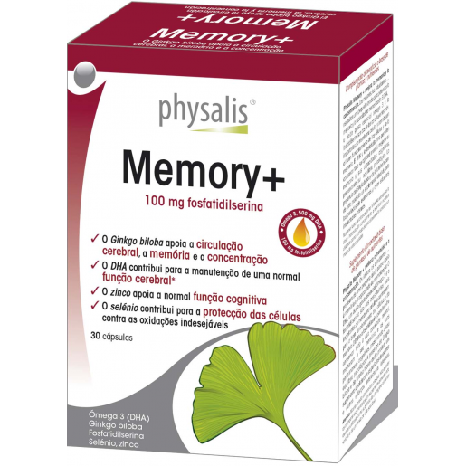 Suplemento alimentar à base de plantas e de nutrientes. idosos, estudantes, gestores… todos, mais cedo ou mais tarde necessitamos de um pequena ajuda para estimular a nossa memória! Physalis Memory+ é um complexo à base de óleo de peixe com elevado teor em DHA (70%), um ácido gordo essencial ómega 3 que contribui para a manutenção da normal função cerebral*. Além disso, as substâncias ativas do Ginkgo biloba suportam a memória e a concentração e promovem a circulação sanguínea (no cérebro). A adição de oligoelementos como o zinco e selénio permite apoiar a função cognitiva e contribuem para a proteção das células contra as oxidações indesejáveis. Contém ainda fosfatidilserina! (* O efeito benéfico é obtido através da ingestão diária de 250 mg de DHA, o correspondente a 1 cápsula de Physalis Memory+).