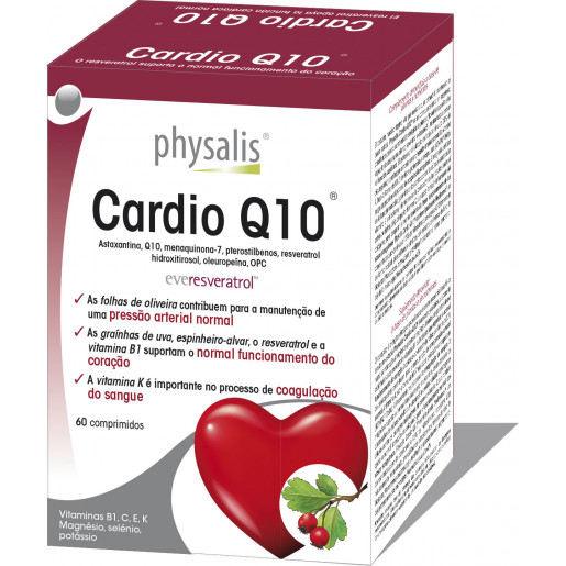 Suplemento alimentar à base de plantas e de nutrientes. O coração é o órgão vital por excelência, é assim essencial mantê-lo em bom estado. Physalis Cardio Q10® é um complexo único, que consiste numa combinação sinérgica de plantas e de (fito)nutrientes, de graínhas de uva espinheiro-alvar, resveratrol e vitamina B1, substâncias que suportam o normal funcionamento do coração. O potássio e o extracto de folhas de oliveira (a 20% de oleuropeína) contribuem para a manutenção de uma pressão arterial normal. A vitamina K, sob a forma de MK-7 em dupla proteção e encapsulado (K2VITAL® Delta), é importante no processo de coagulação do sangue. O magnésio suporta o normal funcionamento muscular e, assim também as contracções do músculo cardíaco. A vitamina E e o selénio ajudam a proteger as células contra as oxidações indesejáveis, tal como a vitamina C, que também apoia a normal formação de colagénio para o funcionamento normal dos vasos sanguíneos. Physalis Cardio Q10® contém ainda Mediteanox®, um concentrado puro de azeitonas a 15% de hidroxitirosol, coenzima Q10 naturalmente fermentada, pterostilbenos extraídos dos troncos de kino de Malabar (Pterocarpus marsupium) e AstaPure®, a astaxantina natural (carotenóide) proveniente das microalgas Haematococcus pluvialis.