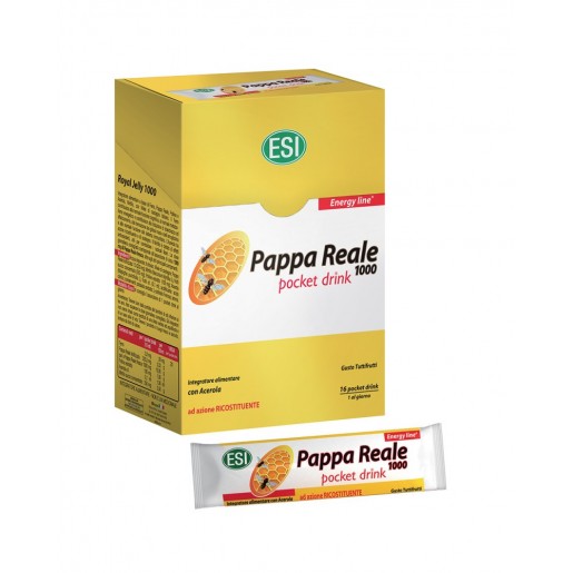 Royal Jelly 1000 pocket drink da Esi é um suplemento alimentar à base de Ferro, Geleia real, Pólen, Acerola, Mirtilo, com Mel de Castanheiro Italiano.