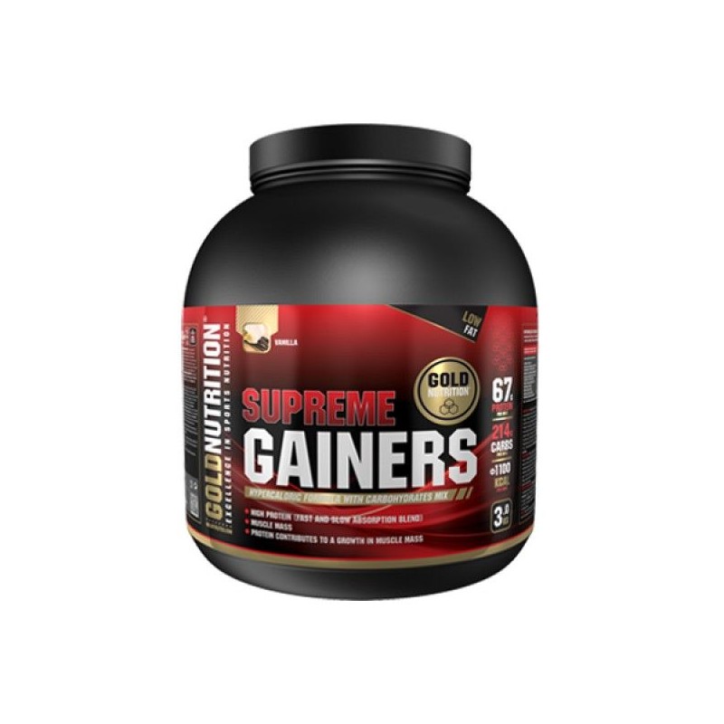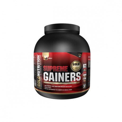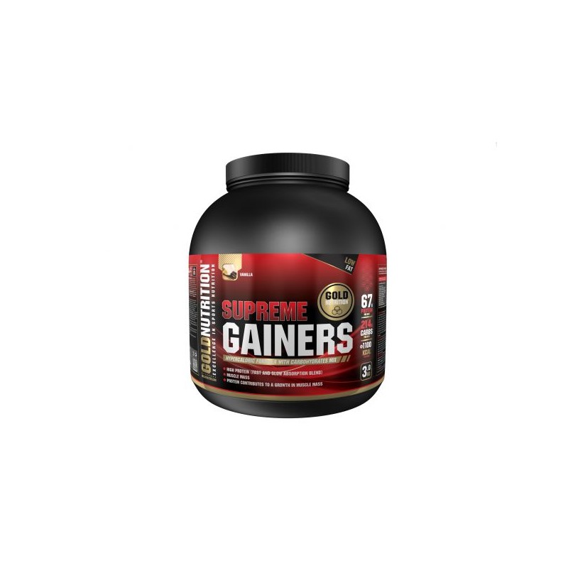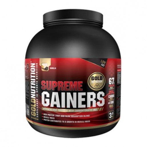 Supreme Gainers GoldNutrition® é uma fórmula especialmente concebida para promover o máximo aumento do peso corporal e o ganho de massa, podendo ser utilizado também como reforço alimentar em indivíduos com dificuldades de alimentação ou falta de apetite. Esta fórmula, de baixo teor de gorduras, combina proteínas de absorção rápida (soro do leite) e absorção lenta (caseínas) permitindo uma síntese proteica eficaz a nível muscular, com hidratos de carbono de fácil digestão e alto índice glicémico.