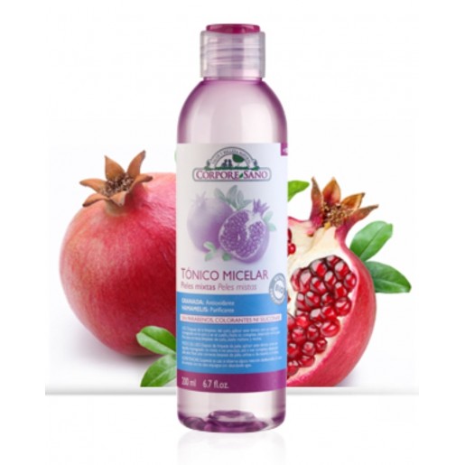 Tónico Micelar Peles Mistas com extratos de Romã e Hamamélis é ideal para a limpeza da pele de impurezas, remover os vestígios de maquiagem e tonificar e hidratar a pele.