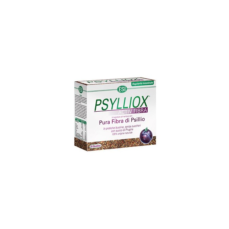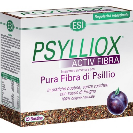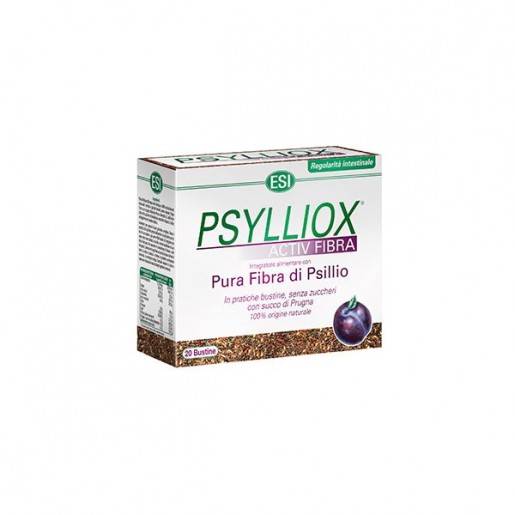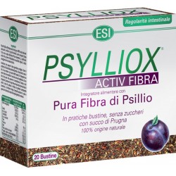 Útil para a regulação fisiológica e o bem-estar intestinalPsylliox é um suplemento alimentar com elevada dose de fibra pura de Psyllium e sumo e polpa de ameixa (rico em pectina e fibras vegetais para estimular a motilidade intestinal), componentes muito úteis para a regulação fisiológica e o bem-estar intestinal. O Psyllium absorve muita água e provoca o aumento do volume das fezes, tornando-as mais suaves e deslizantes, favorecendo assim a evacuação. Exerce um efeito prebiótico, promovendo o desenvolvimento da flora intestinal, importante para o fortalecimento do sistema imunitário. Tem a vantagem adicional sobre outras fontes de fibra de reduzir a flatulência e a distensão abdominal. A casca da semente de Psillyum (Plantago ovata) contém uma elevada percentagem de substâncias mucilaginosas especiais: polissacáridos complexos que pertencem à categoria de fibras solúveis. A principal característica de tal mucilagem é a de inchar em contacto com a água e expandir-se, aumentando até cerca de 25 vezes o próprio peso, transformando-se em gel. O Psyllium contém substâncias que exercem efeitos metabólicos e mecânicos, podendo ser utilizada na prevenção e tratamento de doenças. Os compostos hidrossolúveis e insolúveis em água (flavonóides) possuem importante atividade imunoestimulante. Estudos demonstram que o consumo de Psyllium melhora a flora intestinal, com um aumento da produção de ácidos gordos de cadeia curta, principalmente o butirato, que estimula a proliferação de colonócitos, aumenta a viscosidade luminal, inibe a aderência bacteriana à mucosa intestinal e possui importantes propriedades anti-neoplásicas. O seu consumo de também apresenta efeitos positivos no transito intestinal e no aumento do volume e frequência fecal devido à capacidade de reter água, auxiliando no tratamento da obstipação crónica. As fibras solúveis do Psyllium têm a capacidade de reter gordura sendo indicadas no tratamento de dislipidemias, reduzindo o colesterol total e o LDL, diminuindo os riscos de doenças cardiovasculares. Também têm a capacidade de reter açúcares, diminuindo a absorção intestinal da glicose. contribuindo para a redução do peso corporal. Também possuem um efeito profilático e terapêutico no tratamento de doenças intestinais e metabólicas. O Psyllium pode fornecer a fibra que falta em dietas de baixo teor em açúcares Cada 100 gramas de Psyllium fornece 71 gramas de fibra solúvel, (a mesma quantidade de farelo de aveia contém apenas 5 gramas de fibra solúvel). Psyllium também tem sido utilizado para a síndrome do intestino irritável (um transtorno de stress relacionados com surtos alternados de diarréia e obstipação). É usado por pacientes com fissura anal e hemorróidas e é frequentemente recomendada após a cirurgia anal ou retal, durante a gestação e como tratamento secundário, em certos tipos de diarréia. Tem a vantagem adicional sobre outras fontes de fibra de reduzir a flatulência e a distensão abdominal. Pode ser recomendado por um médico para ajudar a amolecer as fezes e reduzir a dor associada com hemorróidas.