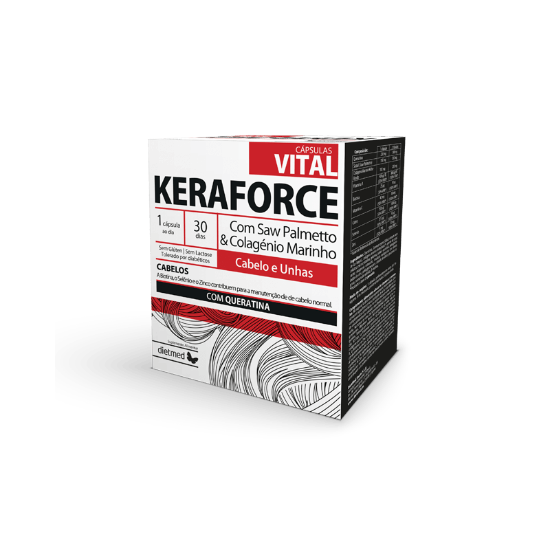 Keraforce Vital é um suplemento alimentar à base de vitaminas e minerais, com queratina, saw palmetto, colagénio marinho e outros componentes contribuem para a manutenção de uma pele normal e os cabelos e unhas mais saudáveis.