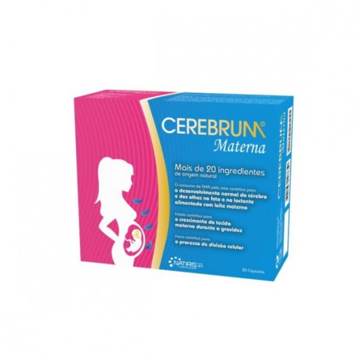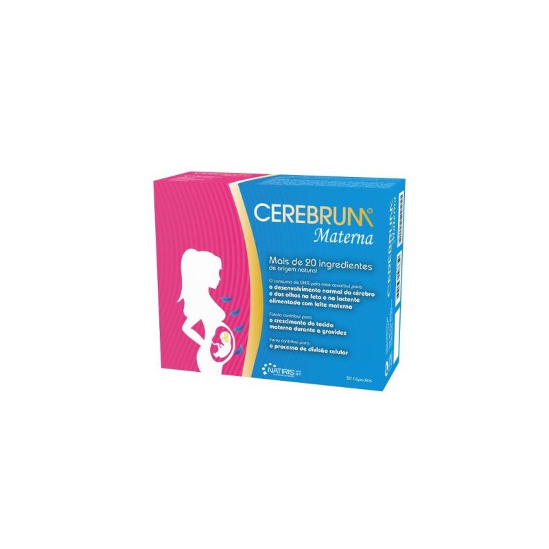 CEREBRUM Materna é uma fórmula segura e única que contém fosfatidilcolina, ómega-3 (DHA especial para mulheres grávidas), ácido fólico, juntamente com várias vitaminas e minerais essenciais, nas quantidades ideais, tanto para a mãe como para o bebé. Este suplemento assegura o desenvolvimento e crescimento adequados do cérebro do bebé durante a gravidez e lactação, bem como para a mãe. O consumo de DHA pela mãe contribui para o DESENVOLVIMENTO NORMAL DO CÉREBRO E DOS OLHOS no feto e no lactente alimentado com leite materno.