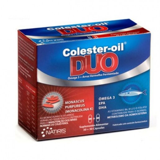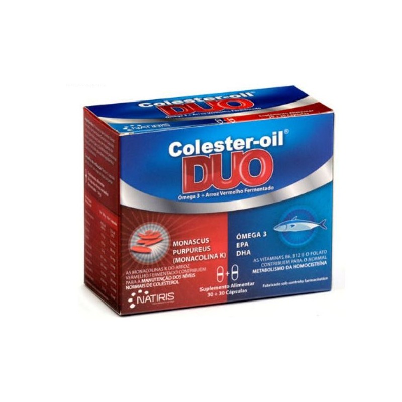 O Colester Oil Duo é uma mistura de óleos de peixe rica em EPA e DHA + Monascus purpureus (Arroz vermelho fermentado), com Monacolinas K, Vitaminas B2, B6, B12 e Ácido fólico. O EPA e o DHA contribuem para o normal funcionamento do coração. A Riboflavina contribui para a protecção das células contra as oxidações indesejáveis. As vitaminas B6, B12 e o folato contribuem para o normal metabolismo da homocisteína.