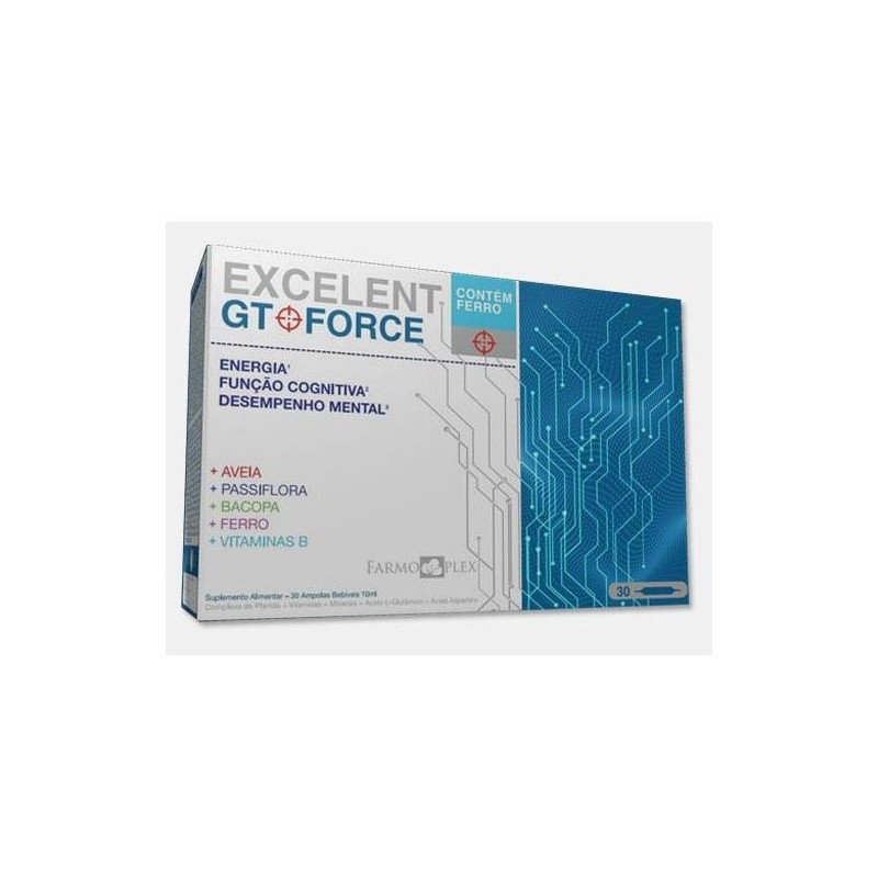 Excellent GT Force, da Farmoplex é um suplemento alimentar, à base de um complexo de plantas, ácido L-glutâmico, ácido aspártico, vitaminas e minerais cuja ação sinérgica visa o reforço da vitalidade física, nervosa e mental de todos aqueles submetidos a situações de cansaço físico e mental, ansiedade, stress e angústia intensas. Os seus ativos permitem reativar as funções hepático-depurativa e eliminatória, contribuem para a normalização as atividades cardíaca e nervosa, e ajudam a tonificar a atividade cerebral: A tiamina e o cobre auxiliam no normal metabolismo produtor de energia. O ferro ajuda na normal função cognitiva. O ácido pantoténico contribui para um desempenho mental normal. A vitamina B6 e a niacina têm um papel na redução do cansaço e da fadiga. A riboflavina ajuda no normal funcionamento do sistema nervoso. A vitamina B12 contribui para uma normal função psicológica.