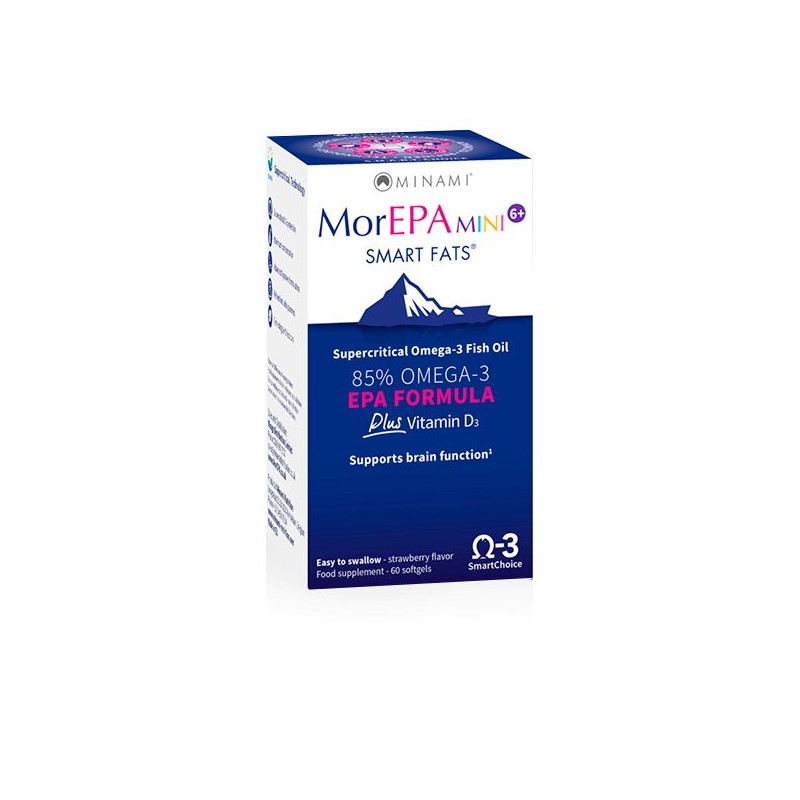 MorEPA Mini-Júnior constitui uma fonte natural de ácidos gordos essênciais Ómega-3 (EPA e DHA), altamente purificados e concentrados, com rigoroso controlo farmacêutico, garantindo a inexistência de metais pesados, sem hexano e sem gorduras transaturadas.
