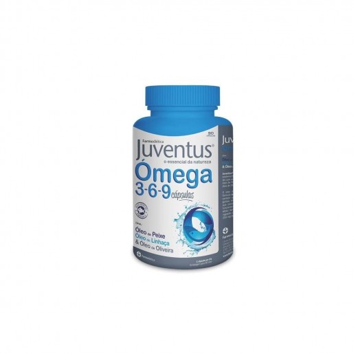 Ómega 3 6 9 da Juventus é um suplemento alimentar em cápsulas que contém um complexo de óleo de Peixe, óleo de Linhaça e óleo de Oliveira. O óleo de Peixe presente na fórmula Juventus® Ómega 3-6-9 contém um alto teor de ácidos gordos ómega-3 - EPA e DHA, que contribuem para o normal funcionamento do coração. Este efeito benéfico é obtido com a ingestão de uma dose diária de 250 mg de EPA e DHA. Uma dose diária de Juventus® Ómega 3-6-9 fornece a quantidade significativa da dose diária recomendada para se produzirem os efeitos preconizados para o EPA e o DHA.