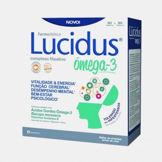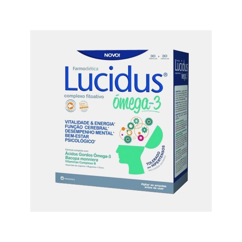 Lucidus® Ómega um suplemento alimentar com uma fórmula completa com Bacopa monniera, vitaminas do complexo B, aminoácidos, aspartato de arginina, magnésio, fósforo e zinco, reforçada com um alto teor de ácidos gordos ómega-3. Apresenta-se sob a forma de ampolas e cápsulas e a sua fórmula foi especialmente desenvolvida para ir ao encontro das necessidades de jovens, adultos e idosos, uma vez que não contém substâncias excitantes. Lucidus® Ómega-3 contribui para o bem-estar, vitalidade, função cognitiva e desempenho mental diário. O magnésio, as vitaminas B2, B6, B12, o ácido pantoténico e a niacina contribuem para o normal metabolismo produtor de energia e têm ainda um papel na redução do cansaço e da fadiga. O ácido pantoténico contribui para o desempenho mental normal e o zinco contribui para uma normal função cognitiva. Em complemento, o magnésio e as vitaminas B1, B6, B12 e a niacina contribuem para o normal funcionamento do sistema nervoso e para uma normal função psicológica. O DHA contribui para a manutenção de uma normal função cerebral, sendo que este efeito benéfico é obtido com a ingestão de uma dose diária de 250 mg de DHA. Uma dose diária de Lucidus® Ómega-3 fornece a quantidade significativa da dose diária recomendada para se produzirem os efeitos benéficos mencionados para as vitaminas e minerais acima referidos e fornece 40% da dose diária necessária para se produzirem os efeitos benéficos mencionados para o DHA.