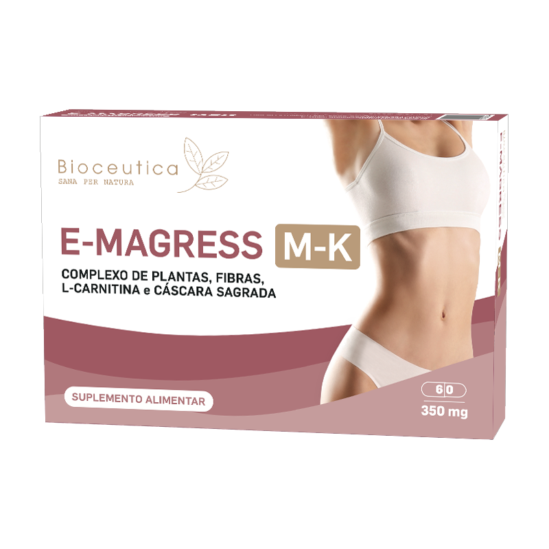 E-Magress MK é um complemento ideal nos regimes de emagrecimento em caso de trânsito intestinal irregular. Contém cáscara sagrada e boldo que ajudam a manter a regularidade intestinal. O extrato de toranja contém bioflavonóides que ajudam a proteger as células contra os radicais livres. As fibras de cereais apoiam a frequência e número de movimentos intestinais, facilitando ainda a manutenção de uma flora intestinal adequada ao bom funcionamento do intestino.