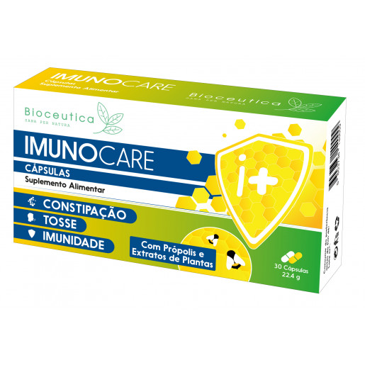 Imunocare cápsulas é um suplemento alimentar com uma composição sinérgica de ingredientes, incluindo: Própolis, com conhecidas propriedades antibacterianas, anti-fúngicas, anti-inflamatórias e imunomodeladoras; Bromelaína, com ação anti-inflamatória e anti-edematosa; e extratos de plantas com propriedades benéficas sobre o sistema imunitário e sobre as afeções do trato respiratório superior, particularmente frequentes no tempo frio. Por isso, Imunocare Cápsulas é a escolha ideal em todas as situações em que se pretende aliviar os sintomas associados à constipação e síndromes de inverno benignas mais comuns, com afeção do trato respiratório superior: inflamação e irritação da garganta, faringe e cordas vocais; rouquidão; tosse seca ou tosse com muco. Em simultâneo, reforça as defesas naturais do organismo, para uma recuperação mais rápida e duradoura, graças ao Própolis, FOS, Echinacea e Zinco. Imunocare cápsulas pode e deve ser recomendado em associação com outros produtos Imunocare, para reforço do sistema imunitário (Imunocare ampolas, Imunocare Vitamina C+D), alívio reforçado da tosse (Imunocare xarope) e ação local para um maior conforto da garganta (Imunocare Pastilhas).