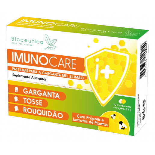 Para o alívio local da irritação e comichão na garganta, associada ou não a tosse e rouquidão, proporcionando maior suavidade no trato respiratório superior. Imunocare Pastilhas Mel e Limão contém Própolis, Echinacea, Malva e Musgo-da-Islândia que atuam em sinergia no alívio da tosse e da rouquidão temporária; na suavização da irritação da garganta; no tratamento e profilaxia das infeções respiratórias recorrentes; no reforço do sistema imunitário e das defesas naturais do organismo. Imunocare Pastilhas Mel e Limão pode e deve ser recomendado em associação com outros produtos Imunocare: para reforço do sistema imunitário – Imunocare ampolas, Imunocare Vitamina C + Vitamina D, Imunocare Vitamina C + Echinacea + Zinco; para alívio reforçado da tosse – Imunocare xarope; para ajudar a combater os sintomas da constipação e infeções do trato respiratório superior – Imunocare Cápsulas.
