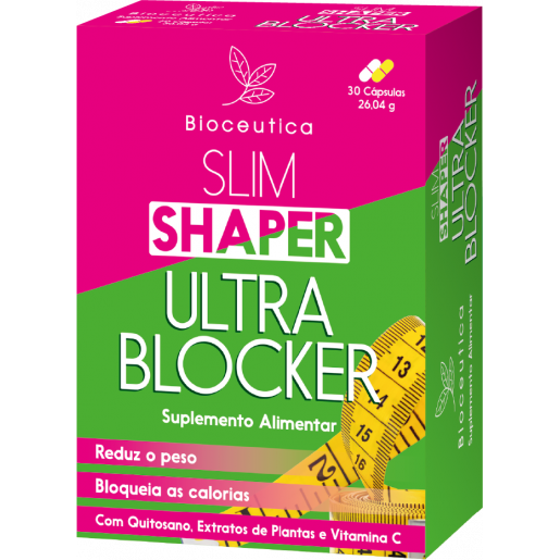 Suplemento alimentar constituído por Quitosano, extratos de plantas e vitamina C, destinado a adultos que pretendem perder peso de forma saudável. Contribui para a redução da absorção de açúcares e gorduras, ajuda a controlar os níveis de glucose e facilita o metabolismo das gorduras, o que contribui para o controlo do peso. Ajuda a reduzir o apetite e o consumo de calorias. Assim, Slim Shaper Ultra Blocker é o complemento ideal para ajudar a reduzir o peso, no âmbito de uma dieta baixa em calorias e associada à prática de atividade física.