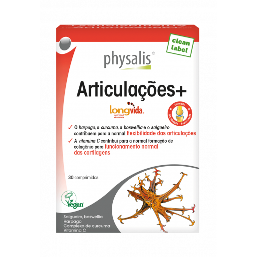 Suplemento alimentar à base de plantas e nutrientes. Physalis Articulações+ é um complexo de elevada qualidade, contendo extratos da resina de incenso e harpago. Estas duas substâncias são conhecidas por conterem princípios ativos que contribuem para a flexibilidade das articulações. O extrato de salgueiro suporta esta ação. Adicionámos extrato de raiz de curcuma, que participa na flexibilidade e saúde das articulações. O complexo de curcuma, que tem sido objeto de numerosos estudos e de uma patente (Longvida®), é 65 vezes mais absorvido do que o extrato curcumina padrão. A vitamina C contribui para a normal formação de colagénio para funcionamento normal das cartilagens. O exercício físico e uma alimentação saudável favorecem o bom estado do sistema motor.