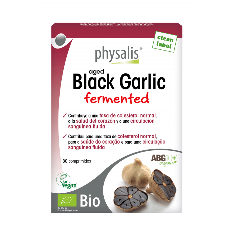 Suplemento alimentar à base de plantas Physalis Black Garlic bio contém ABG10+®, um extrato de alho de nova geração produzido a partir de alho fermentado espanhol de elevada qualidade. Graças a o processo de fermentação inovador, o alho contém, após a fermentação, a substância ativa S-alil-cisteína (SAC). O alho fermentado ou envelhecido contribui para uma taxa de colesterol normal e para a saúde do coração e dos vasos.