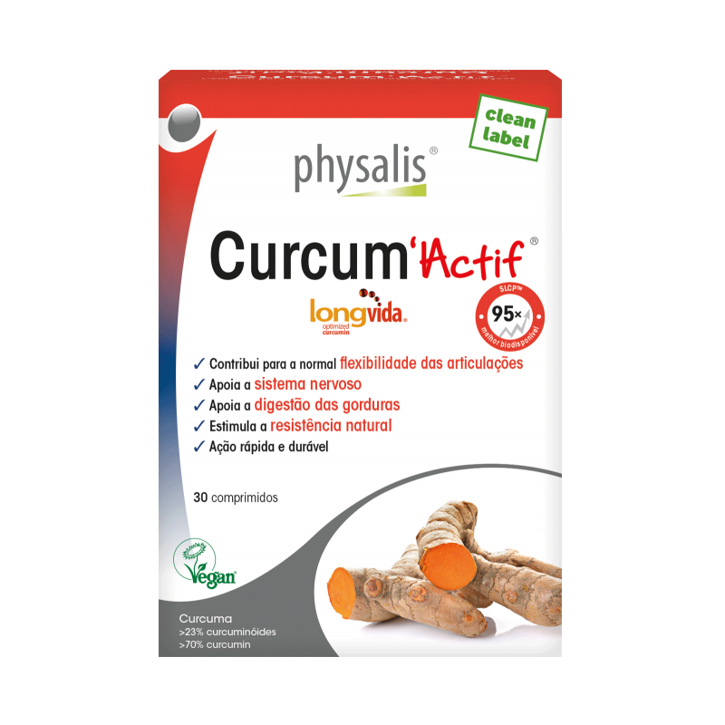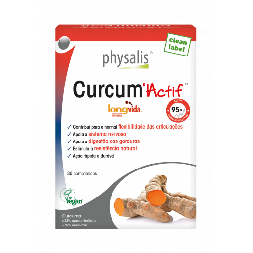 Suplemento alimentar à base de plantas. Physalis Curcum‘Actif contém 400 mg de Longvida®, um complexo patenteado de curcuminóides que foram objeto de numerosos estudos. A sua fórmula exclusiva sob a forma de micropartículas lipossolúveis (Solid Lipid Curcumin Particle technology o SLCPTM) garante que a curcumina é 65 vezes mais biodisponível do que na sua forma não otimizada. A raiz de Curcuma longa não é apenas um tempero muito apreciado na culinária, mas também uma excelente planta medicinal que ajuda a preservar a saúde e a flexibilidade das articulações, que suporta a função hepática (combustão de gorduras), que contribui para a saúde da pele e do sistema nervoso e que estimula a resistência natural.