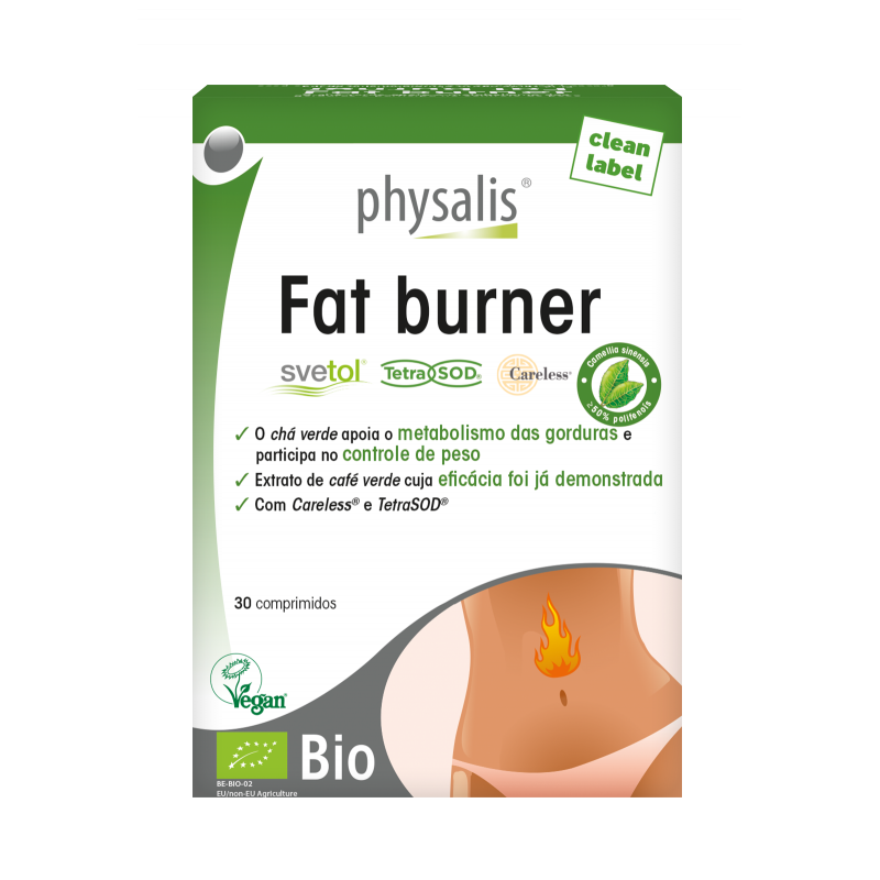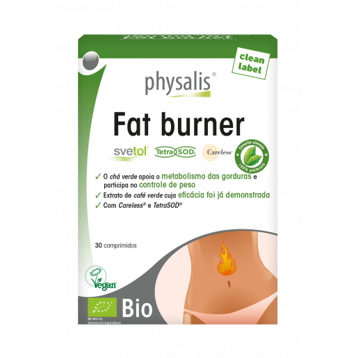 Suplemento alimentar à base de plantas. Physalis Fat burner bio é um complexo 100% biológico, que contém, entre outros, um extrato de chá verde que apoia o metabolismo das gorduras e, assim participa no controle de peso. Contém ainda um extrato de café verde descafeinado (Svetol®) com quantidades mínimas garantidas de 40% de ácidos clorogénicos, e de 10 a 15% de ácido 5-cafeoil- quínico. Svetol® tem uma estrutura única, no seu género (contendo uma proporção específica de 0,2 a 0,3 dos compostos ácido 5-cafeoilquínico/ácidos clorogénicos) cuja eficácia foi já demonstrada. O extrato da baga de schisandra ajuda a desintoxicar o organismo e a promover o bem-estar, no geral. Este complexo é ainda enriquecido com extrato de açaí proveniente da América do Sul, onde as suas bagas são utilizadas desde sempre pelos povos indígenas, pelo seu elevado valor nutritivo. Physalis Fat burner bio deve ser combinado imperativamente com uma alimentação saudável e equilibrada e exercício físico. Beber dois litros de água por dia.