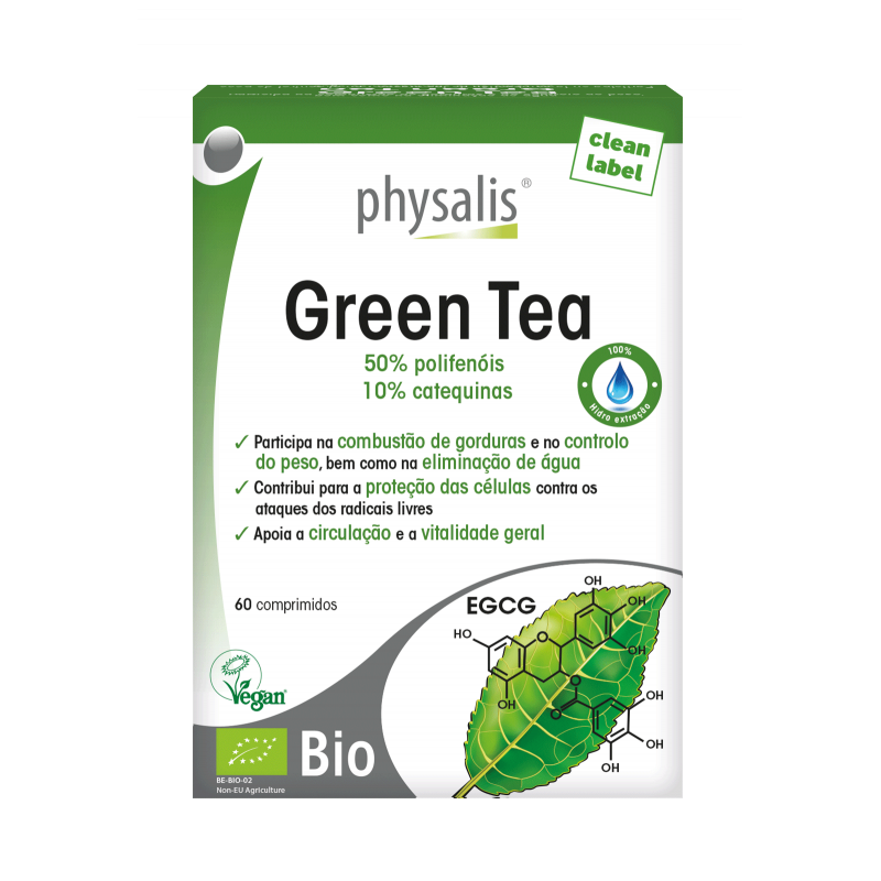 Suplemento alimentar à base de plantas. Physalis Green Tea bio contém um extrato de chá verde 100% biológico obtido por hidro extração e que apresenta uma elevada concentração de polifenóis (não menos de 50%!), entre os quais as catequinas, como a reconhecida epigalocatequina-3-galato ou EGCG. Chá verde é o acompanhamento ideal em caso de dietas de emagrecimento, pois promove a metabolização das gorduras, tem um efeito diurético e estimula a função intestinal. Os ingredientes ativos das folhas do chá verde ou Camellia sinensis, consumidos desde a aurora dos tempos nos países orientais, apoiam a circulação, a vitalidade geral e participarem na proteção das células contra os radicais livres.