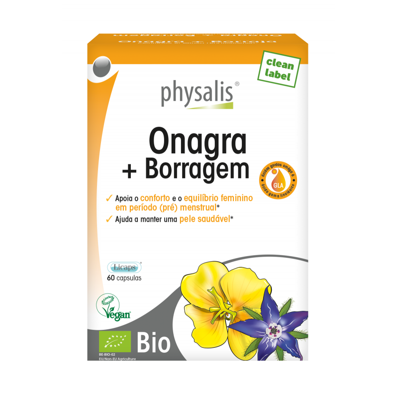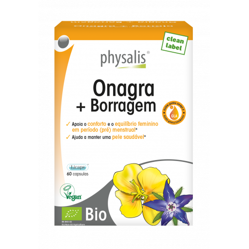 Suplemento alimentar à base de plantas e nutrientes. Sensibilidade extrema no decurso do ciclo menstrual? Numerosas mulheres sofrem alterações hormonais desagradáveis nesta altura: mau humor, irritabilidade, seios tensos,… são os fenómenos menstruais mais normais. Physalis Onagra + Borragem é uma fórmula sinérgica com óleo de onagra e borragem (com GLA ou ácido gama-linolénico), árvore da castidade e vitamina E pura. * O óleo onagra e a árvore da castidade contribuem para o conforto (pré) menstrual. Além disso, a onagra ajuda a manter a pele saudável. A vitamina E contribui para a proteção das células contra as oxidações indesejáveis.