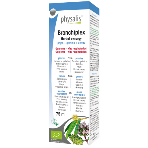 Corrimento nasal, tosse ou uma sensação permanente de fadiga? Todos os anos, o nosso organismo sofre com os pequenos males do inverno. A Mãe Natureza possui alguns remédios naturais que ajudam a prevenir ou aliviar estes casos. Physalis Bronchiplex contém *eucalipto, tomilho, alteia, pinheiro-bravo, sabugueiro e viburno que exercem um efeito suavizante na garganta e nas vias respiratórias e que ajudam a respirar livremente.O amieiro, a hortelã e o alecrim apoiam a nossa resistência natural.