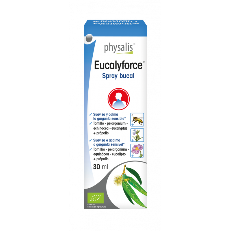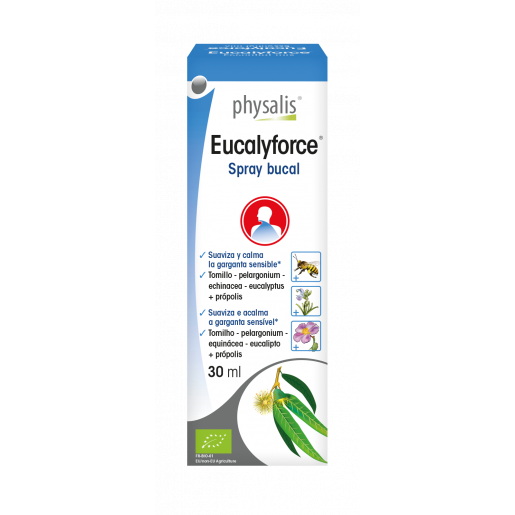 Eucalyforce® spray bucal bio è um spray 100% natural à base de própolis, extractos vegetais e óleos essenciais. O tomilho, o gerânio, a equinácea, a hortelã-pimenta e o eucalipto apoiam as vias respiratórias e aliviam a garganta.