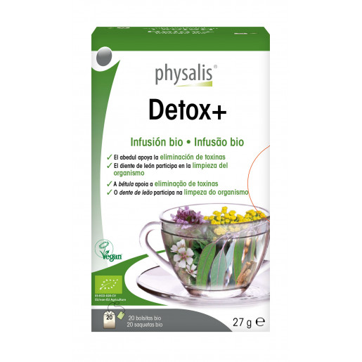 Tez pálida? Fadiga e falta de dinamismo? É essencial garantir uma boa eliminação de toxinas. Physalis Detox+ infusão de plantas bio contém bétula, urtiga e vara de ouro que contribuem para a eliminação de toxinas através dos rins. A grama-francesa e o dente de leão apoiam este processo de desintoxicação. O hibisco ajuda a manter um bom nível de energia e de vitalidade. Sabor suave e agradável. Physalis Detox+ deve, imperativamente, ser combinado com uma alimentação saudável e equilibrada, bem como com a prática de exercício físico. Beber 2 litros de água por dia.