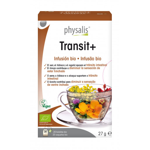 Stress temporário, mudanças de hábitos de vida ou alimentares, viajar,… perturbam às vezes os nossos intestinos. Physalis Transit+ infusão de plantas bio contém sene, hibisco e alcaçuz que suportam o trânsito intestinal. O funcho contribui para diminuir a sensação de ventre inchado. Utilizar para aliviar temporariamente a atividade intestinal. Sabor suave e agradável. Uma alimentação rica em fibras (cereais completos, frutas frescas, alimentos crus,…), praticar exercício físico e ingerir bastantes líquidos são as atitudes certas para favorecer naturalmente a evacuação intestinal.