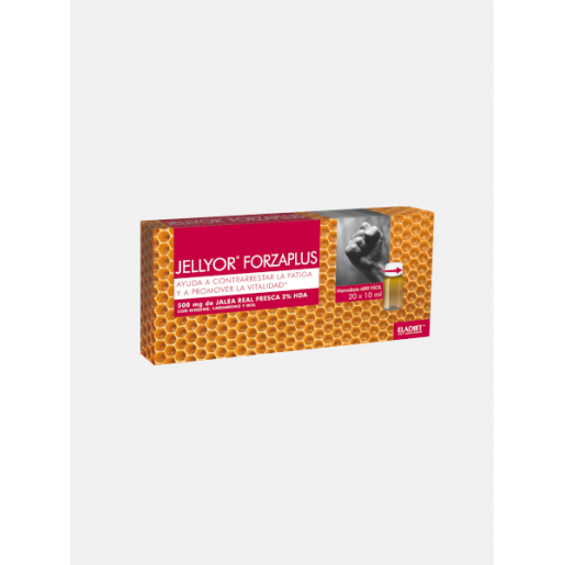 Jellyor Forzaplus da Eladiet é um suplemento alimentar líquido à base de geleia real, gingseng, cardamomo, mel e com um conteúdo mínimo de 2% de HDA.