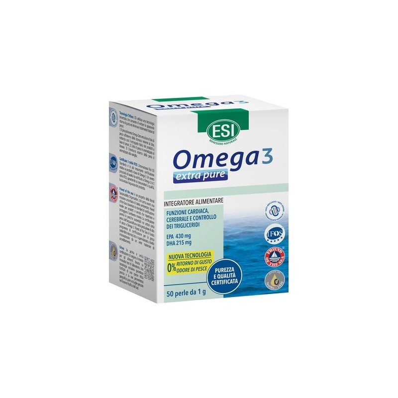 Ómega 3 extra pure by ESI é um suplemento alimentar à base de óleo de peixe concentrado (anchovas do Oceano Pacífico) rico em Ómega 3 e Vitamina E. O Ómega 3 desempenha um papel importante na prevenção de todos os distúrbios circulatórios, incluindo altos níveis de triglicerídeos no corpo. Também é útil para o funcionamento do cérebro, visão e para combater o stress oxidativo. A fórmula trifásica exclusiva deste produto elimina completamente o cheiro desagradável de peixe e o retorno do sabor. O óleo de peixe é aromatizado com limão e a pérola com baunilha. É um produto certificado pelas Normas Internacionais de Óleo de Peixe que garante um produto de qualidade, seguro e puro.