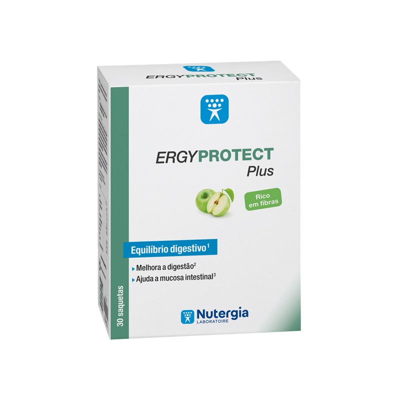ERGYPROTECT Plus é uma associação de glutamina, fibras de maçã e chicória. Contém camomila contribuindo para o conforto digestivo e vitamina B2 que ajuda na protecção das células contra as oxidações indesejáveis e participa na manutenção de mucosas normais, tais como as do intestino.