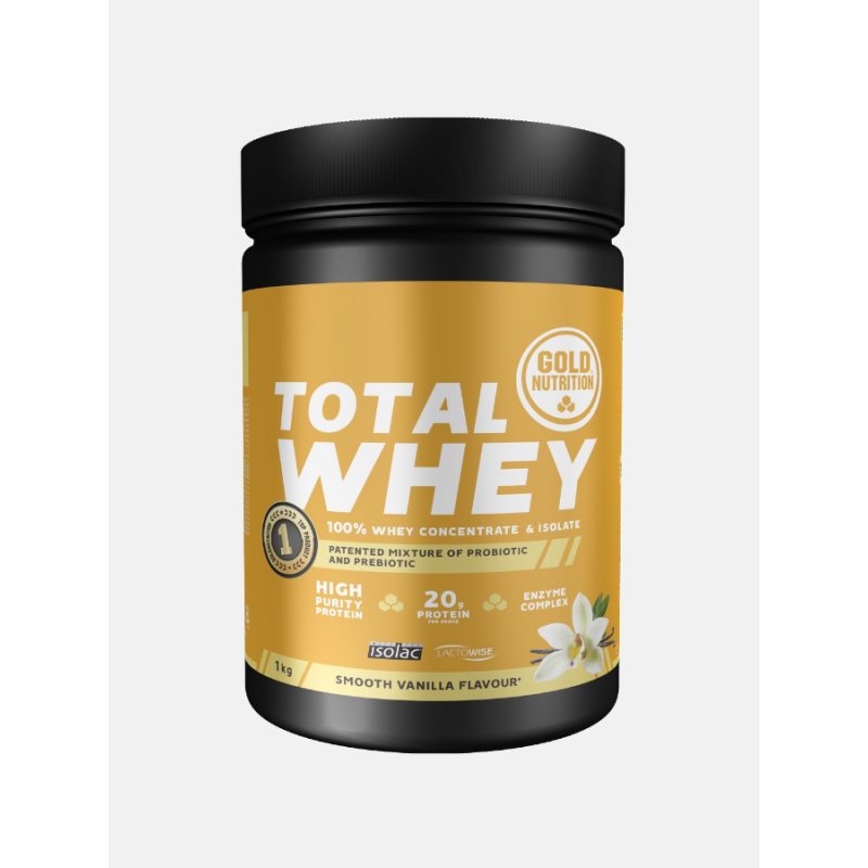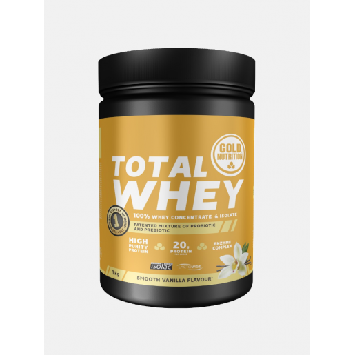 Total Whey da Gold Nutrition é uma fórmula rica em proteína com um baixo teor em gordura e uma concentração reduzida de carboidratos.