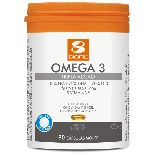 Biofil™ Omega-3 1000 Triglicéridos contém 4 g de óleo de peixe por toma diária, garantindo a ingestão de 2,4 g de PUFA O3 EPA+DHA, sendo 1 g de DHA. O EPA e o DHA contribuem para a manutenção de níveis normais de triglicéridos no sangue (efeito benéfico só obtido com a toma diária de pelo menos, 2 g de EPA e DHA combinados).